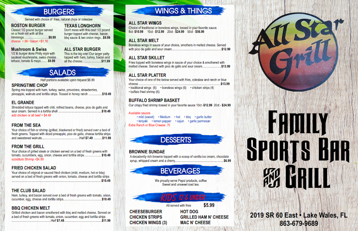 Welcome to All Star Grill, a delightful dining destination located at 2019 State Rd 60 in Lake Wales, FL. This lively spot is perfect for those who crave a combination of heartwarming meals and a casual atmosphere. The menu features enticing entrees like the House Steak, flamed grilled to perfection at $21.99, and the mouth-watering Smothered Fish, a blackened fish fillet drenched in grilled onions and cheese for just $16.49.